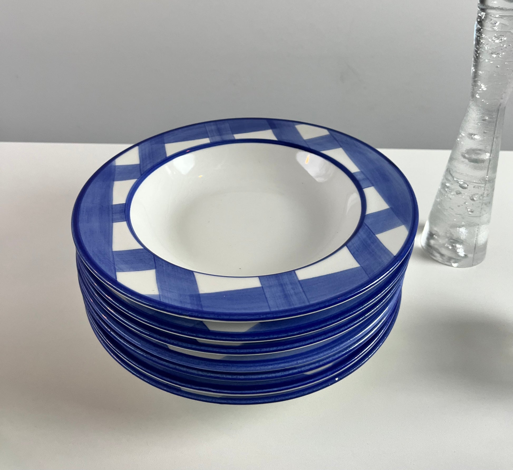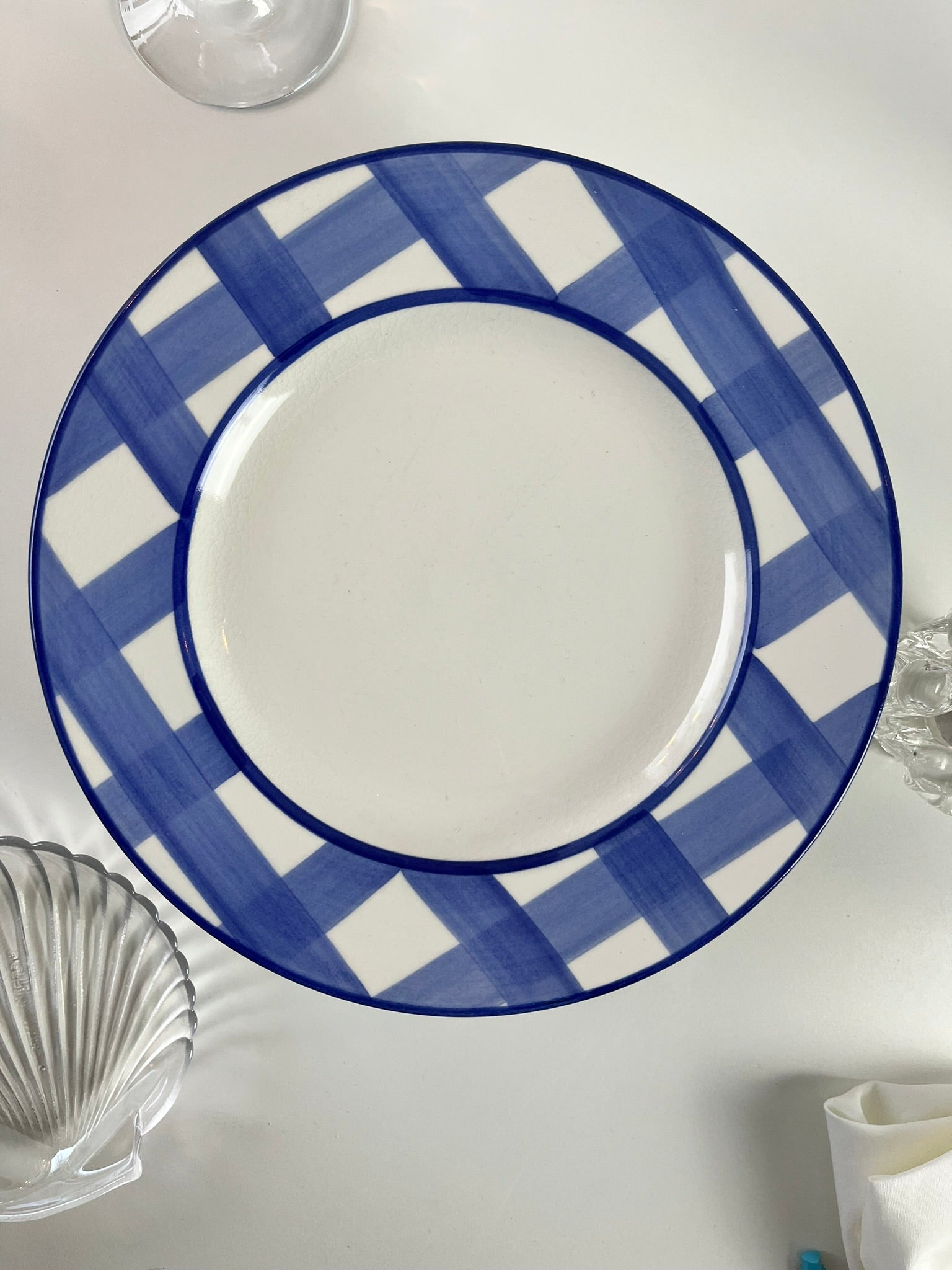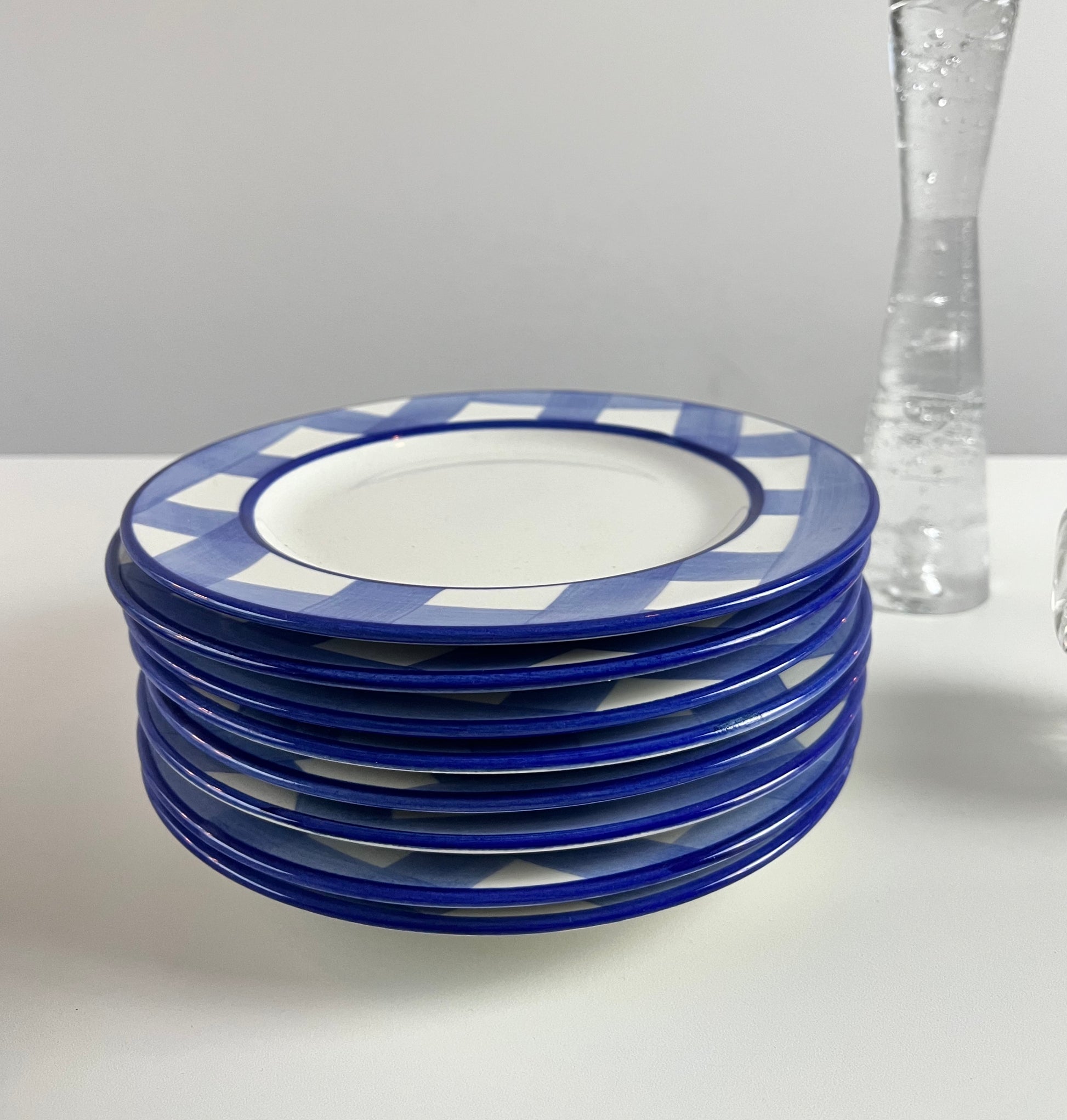 Smukt, retro servicesæt med en blåternet kant. Sættet består af både middagstallerkner, frokosttallerkner og dybe tallerkner, som tilsammen skaber en flot og gennemført borddækning.
