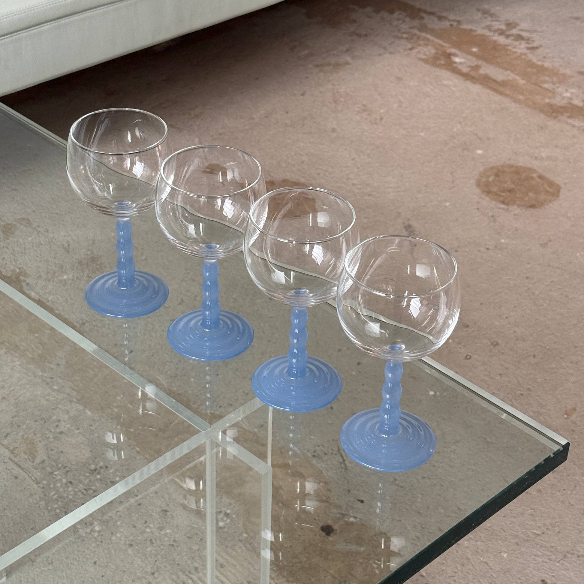 Sjældne vintage vinglas fra Tupperware i klar glas med lyseblå stilk og fod. Glassenes karakteristiske, bølgede stilk giver et legende og retro udtryk, mens den bløde farve tilfører et frisk og sommerligt præg. Perfekte til vin eller drinks.