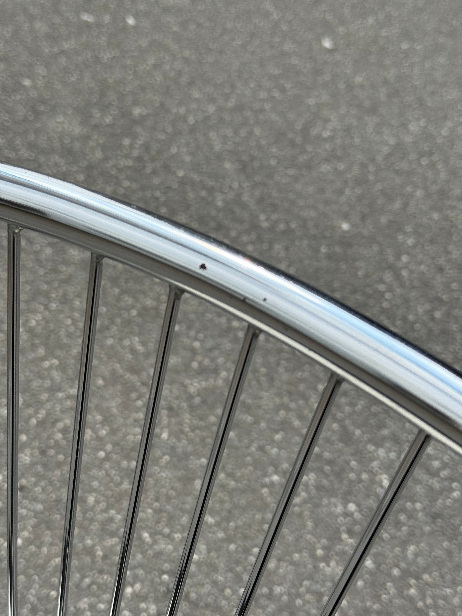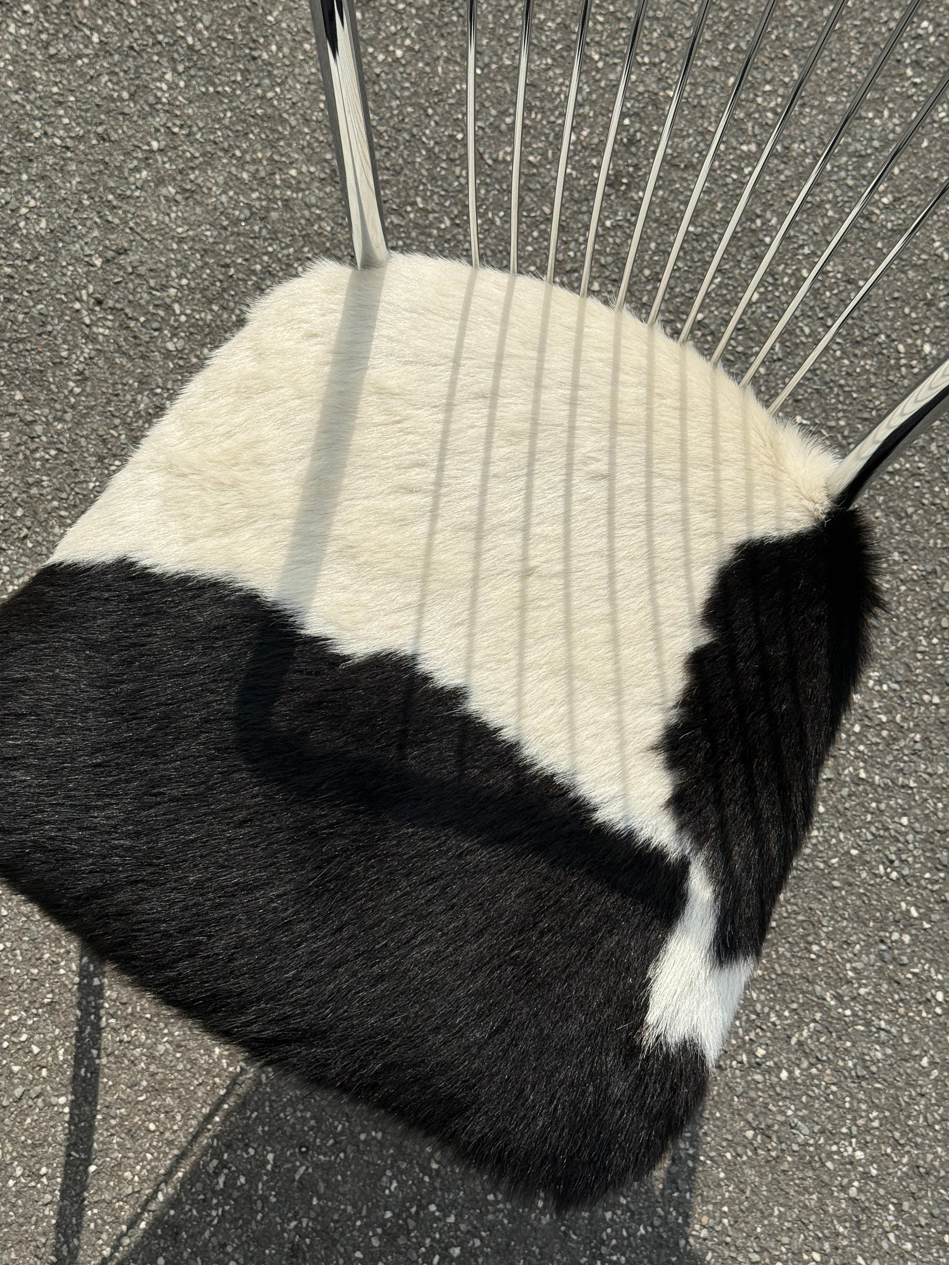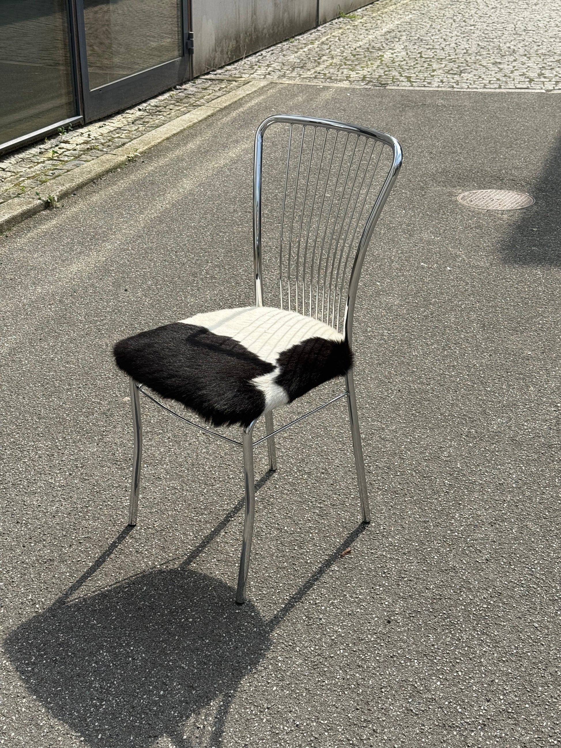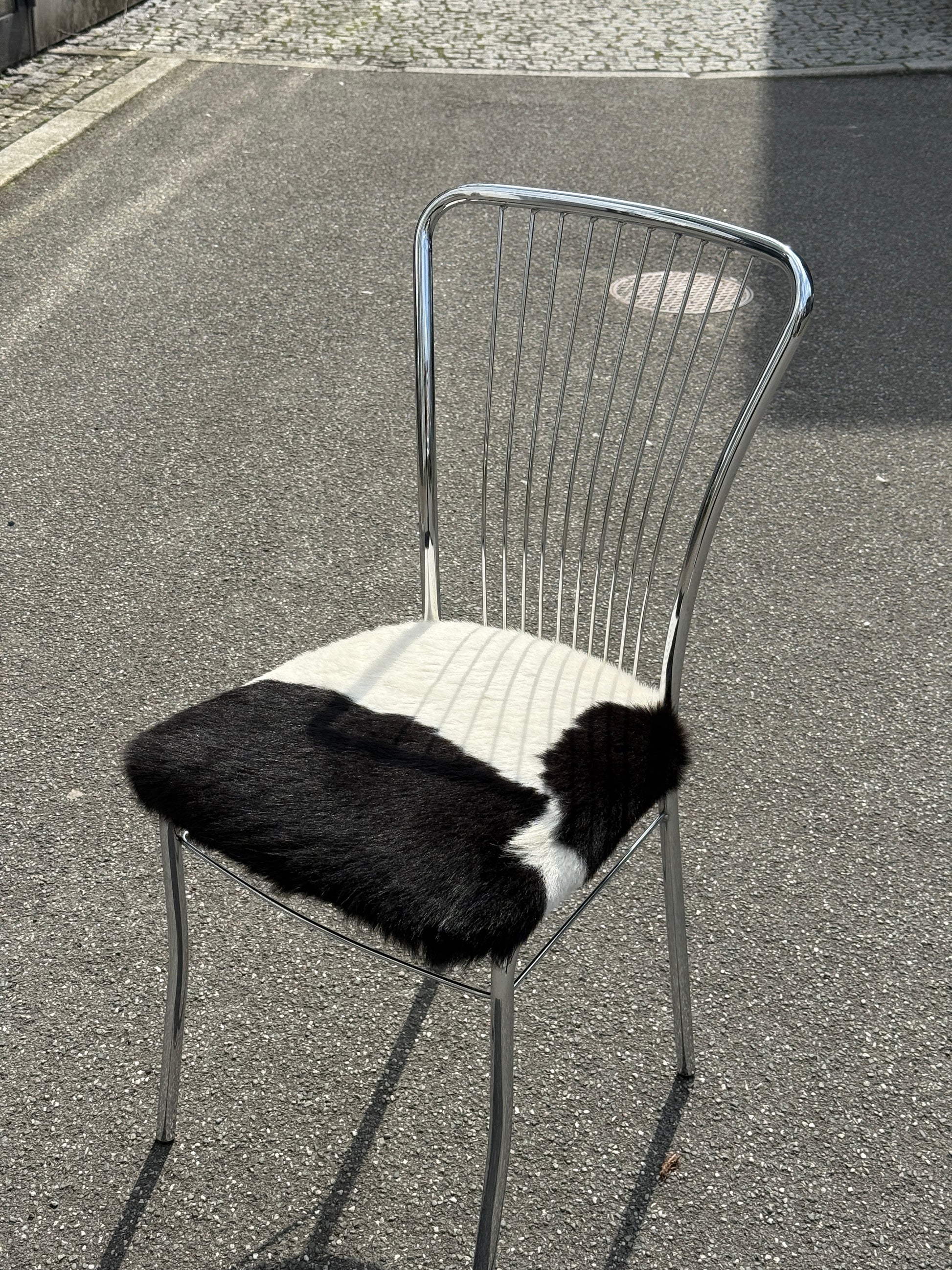 Vintage stol med krom stel og istandsat ægte, fluffy koskind. Perfekt som et centerpiece🪑