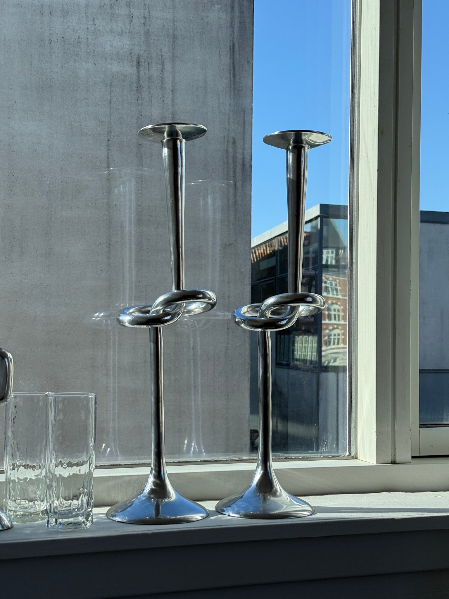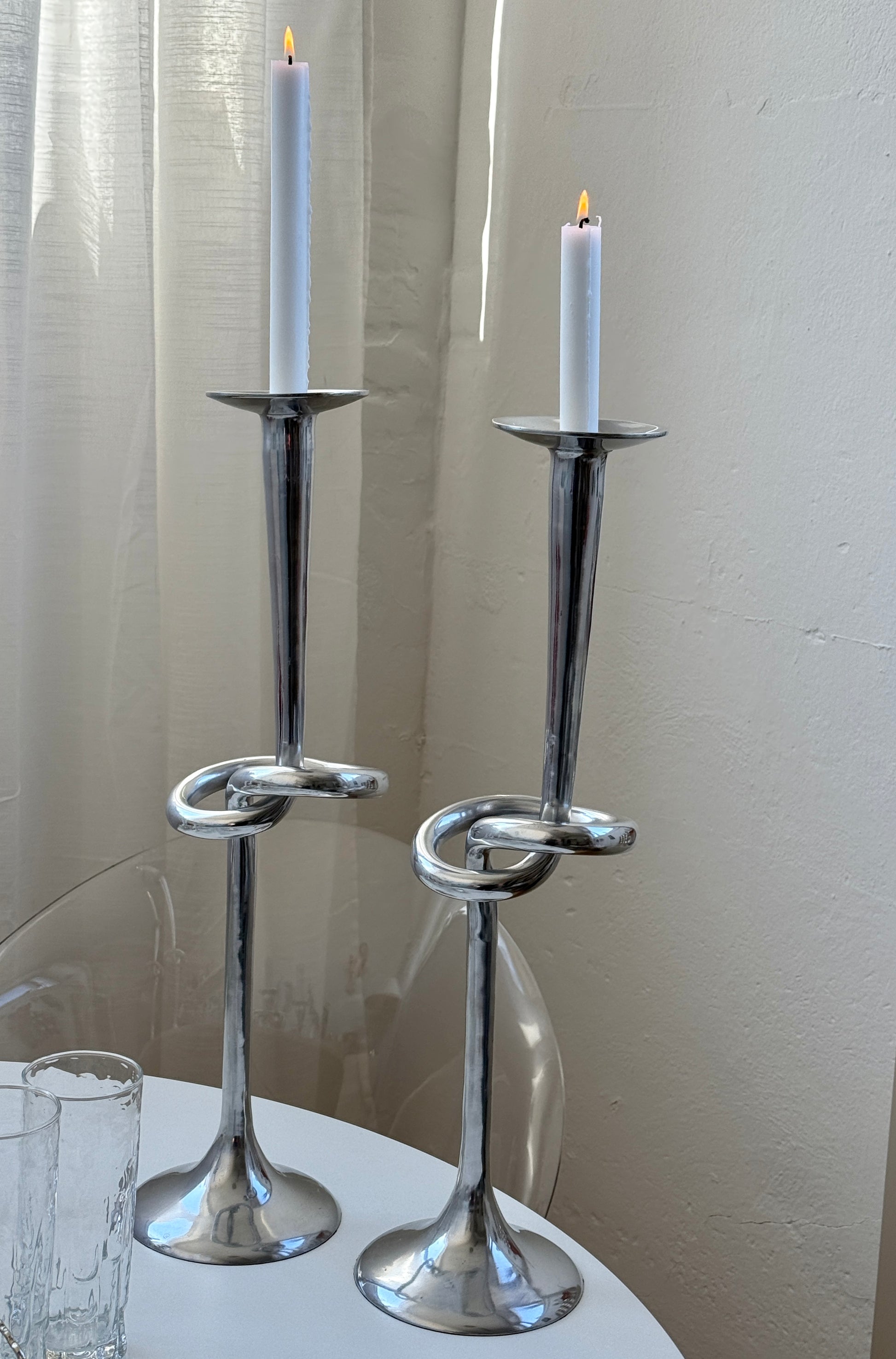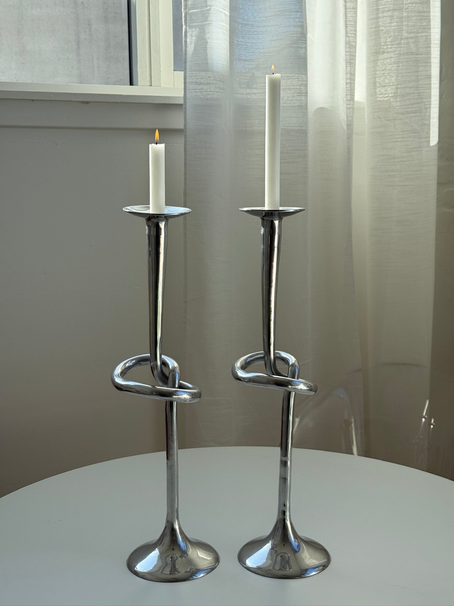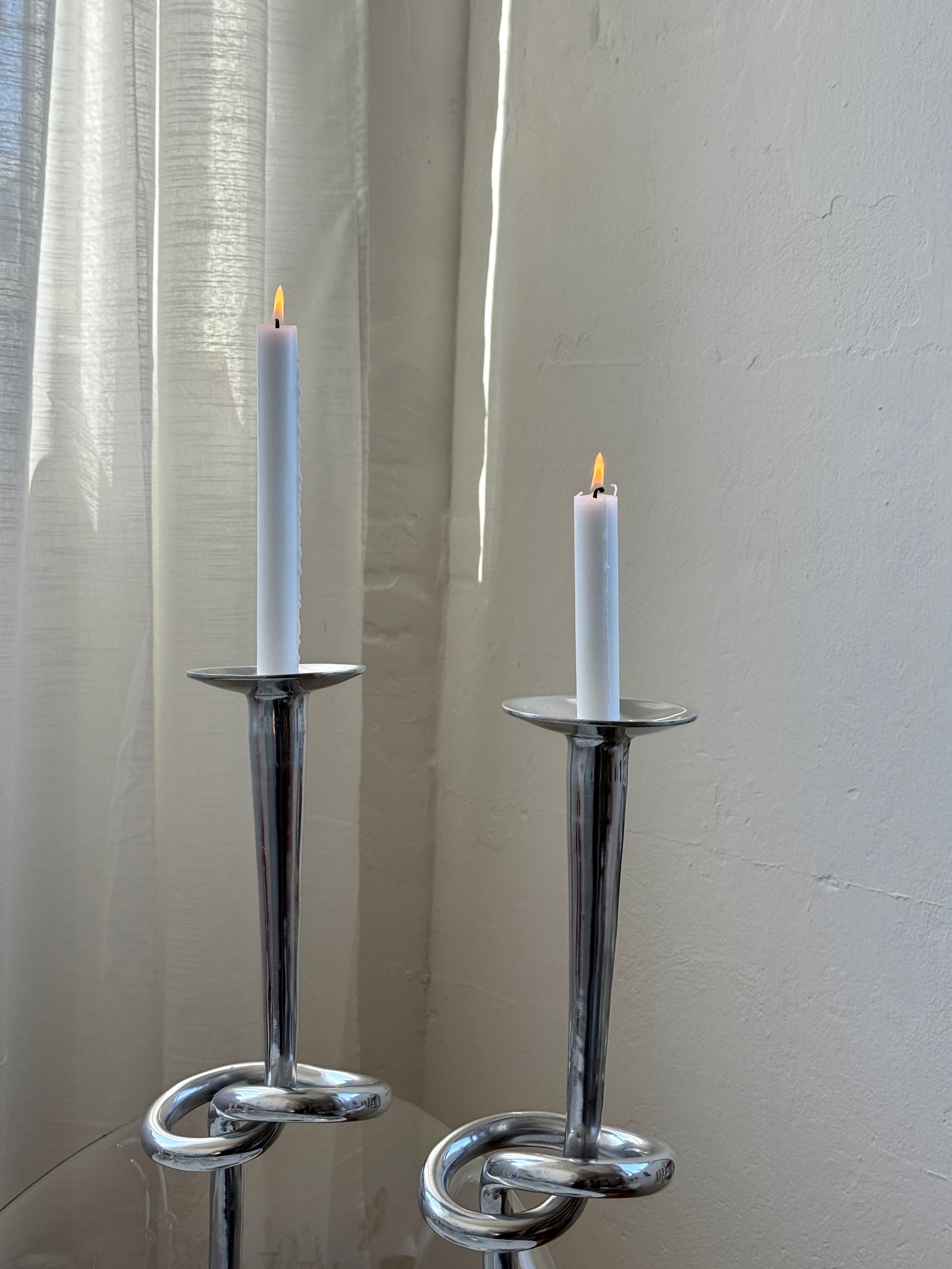 Imponerende vintage lysestager designet af Udesen Denmark, produceret i aluminium. De har et moderne og skulpturelt udtryk med en elegant, slank form og en fin knudedetalje.