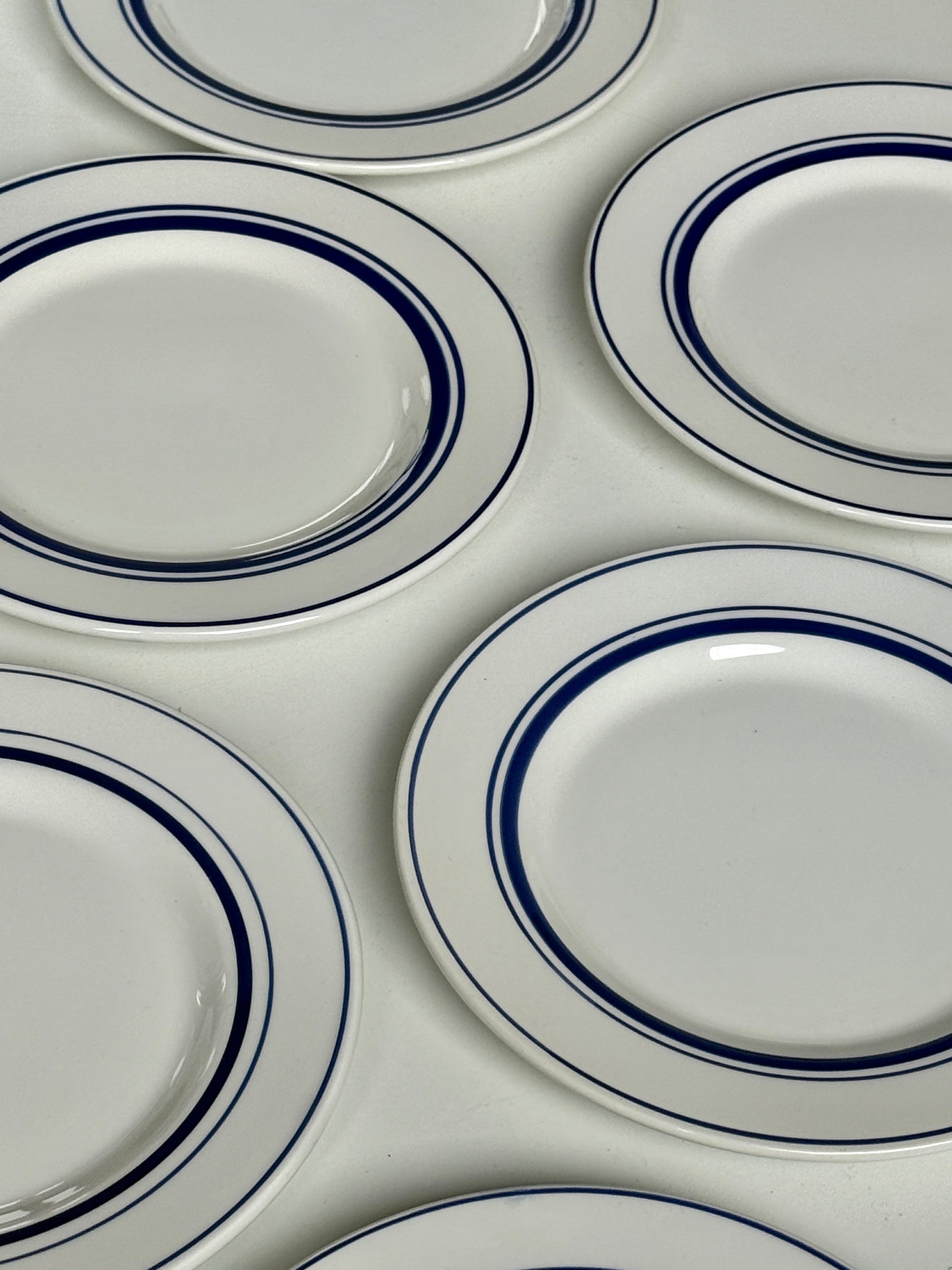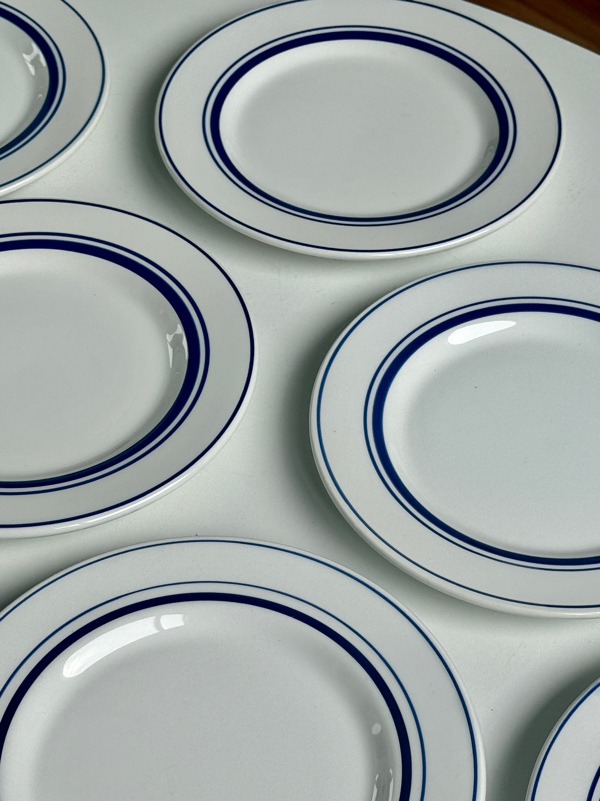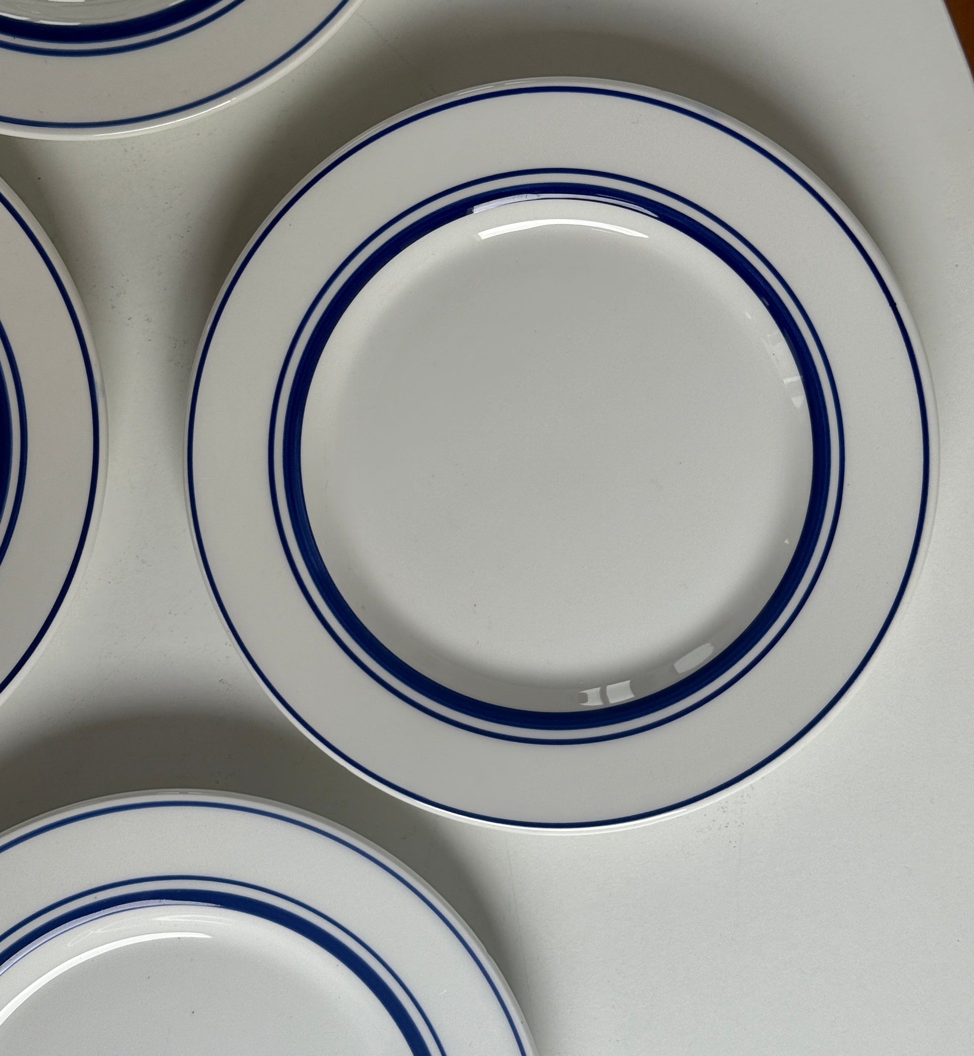 Klassiske bistrotallerkner fra Italien med dobbelt blå stribe og hvid glasur. Et tidløst design, der passer perfekt til både hverdag og servering med et nostalgisk præg.