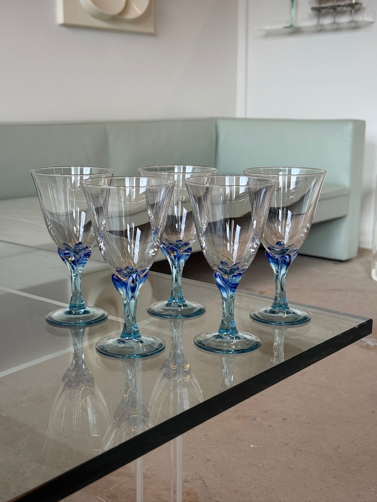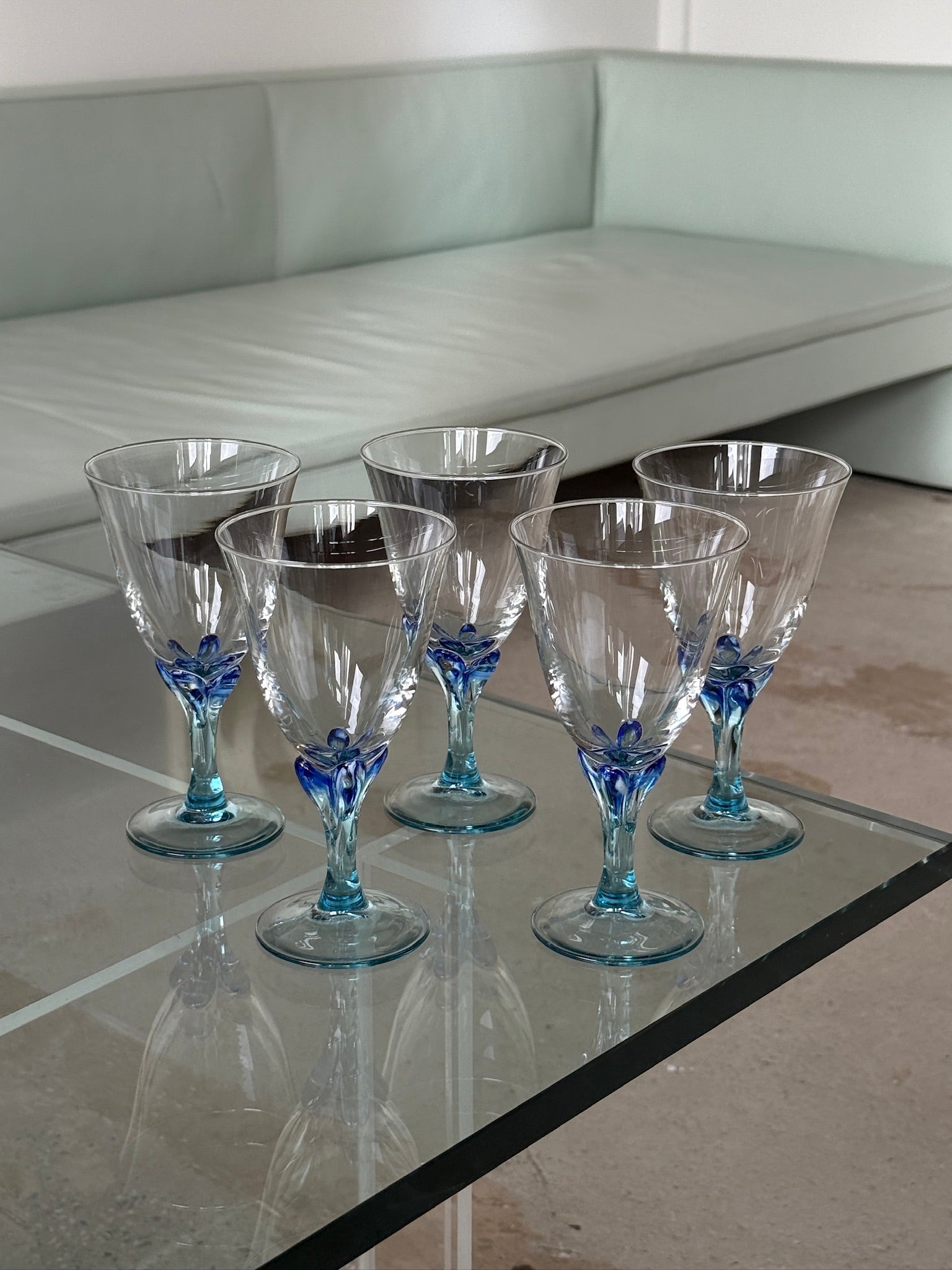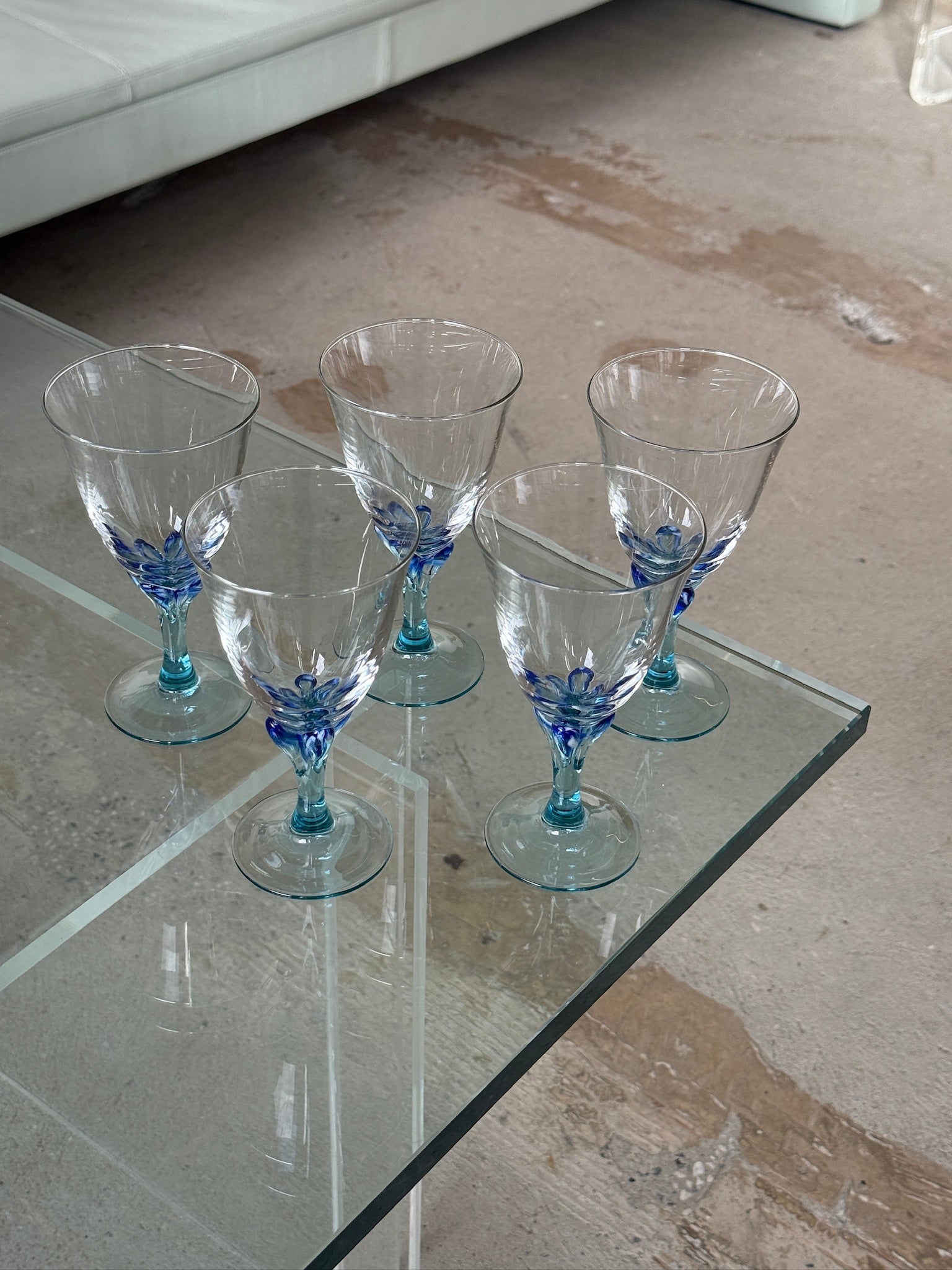 Sæt med fem smukke franske vinglas med dekorativ stilk, der giver associationer til en klokkeblomst. Stilken som er lavet i flere nuancer af blå og et strejf af hvid, gør glassene levende og unikke. Et elegant sæt, der skiller sig ud på bordet – både til hverdagsvin og særlige anledninger. Fundet i Frankrig.