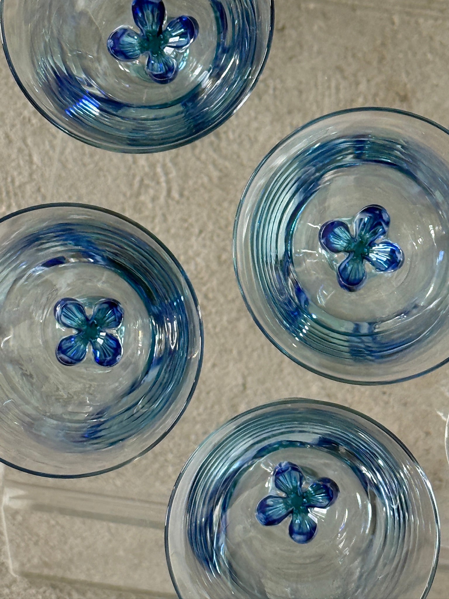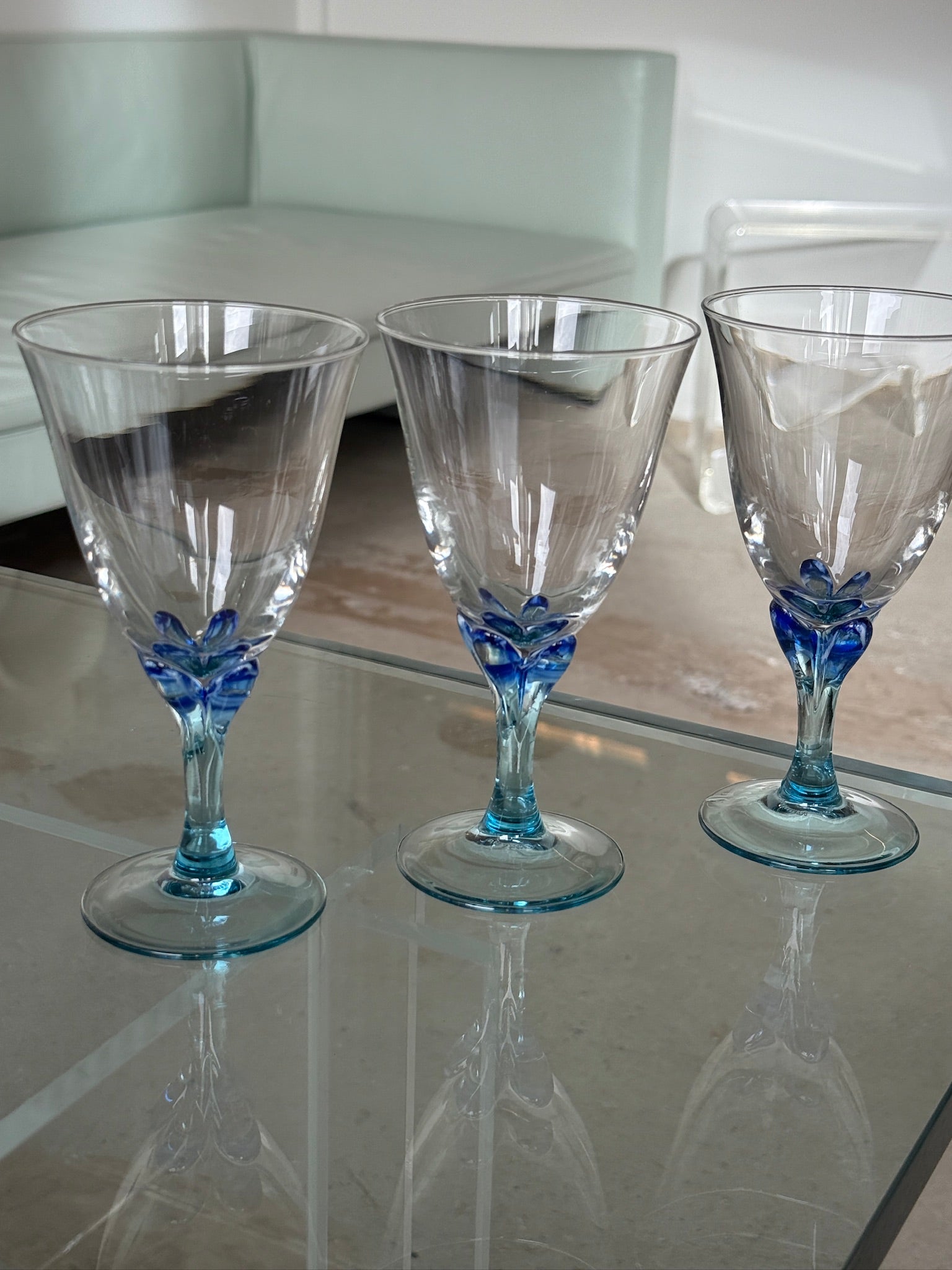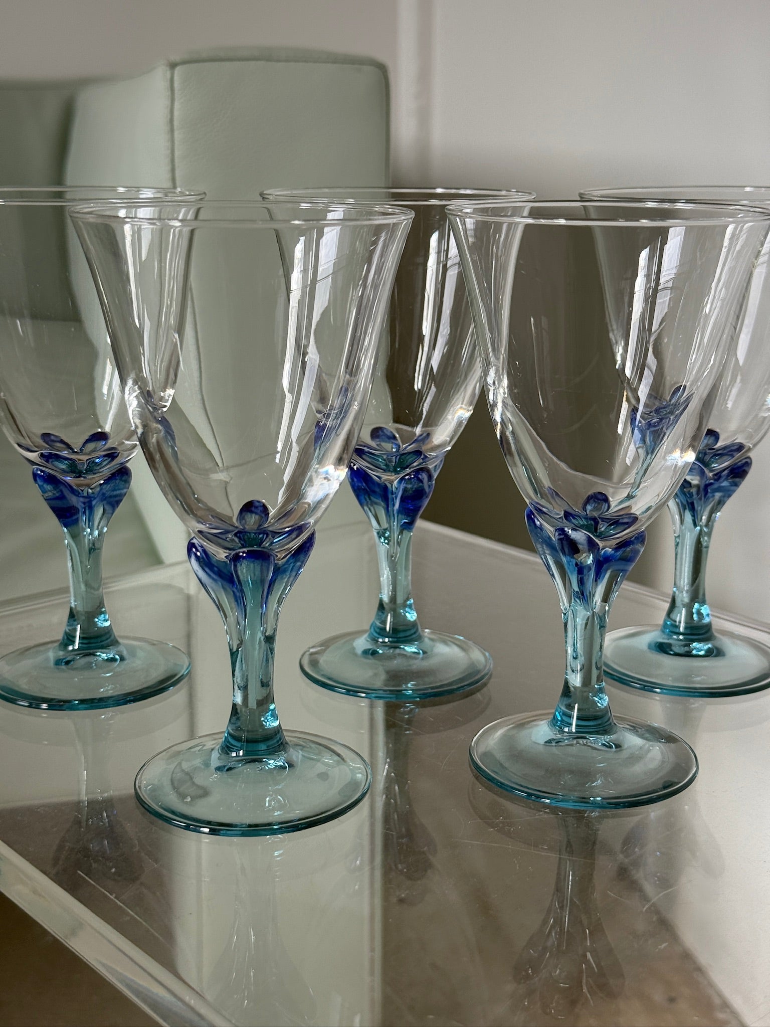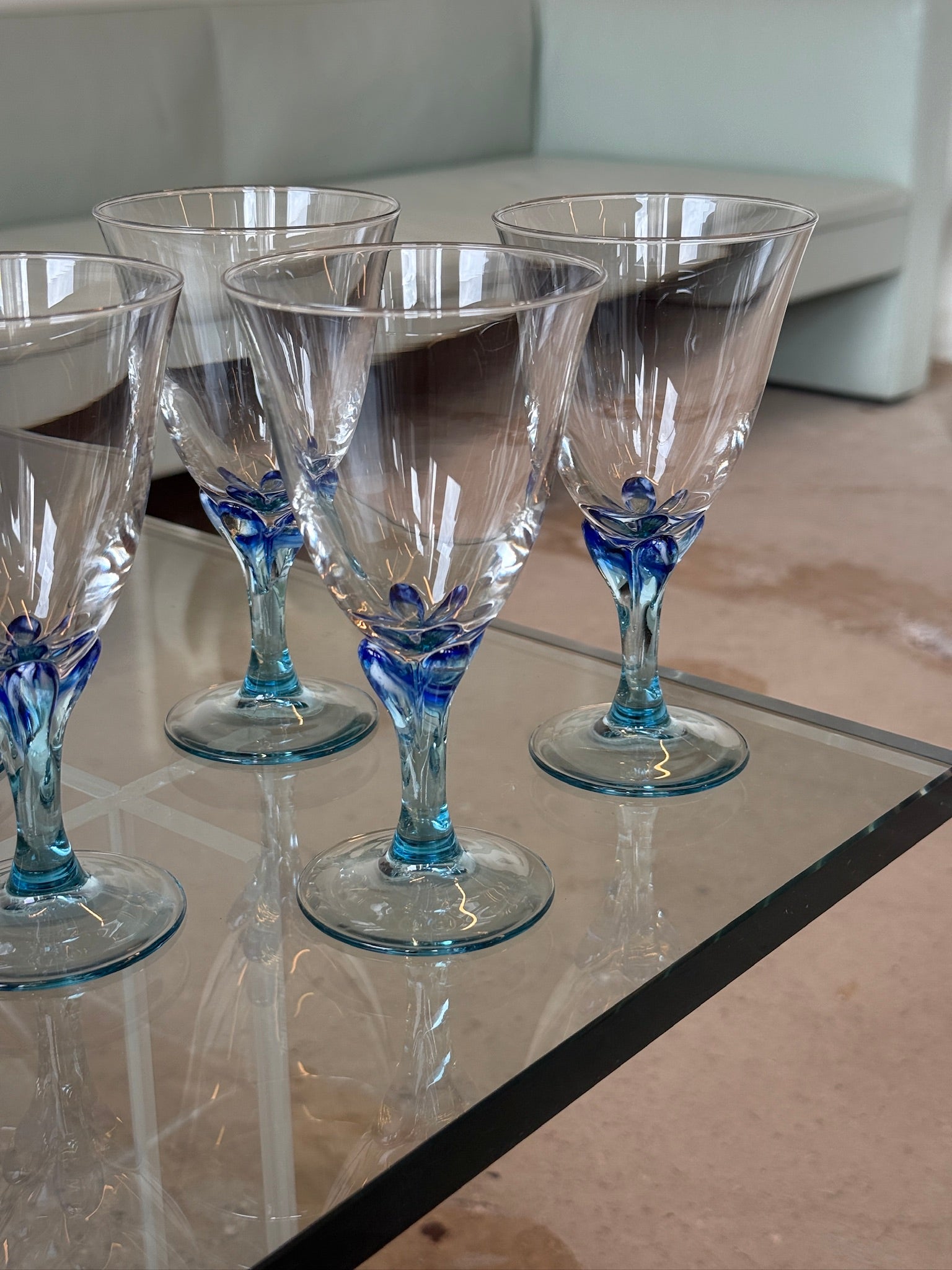 Sæt med fem smukke franske vinglas med dekorativ stilk, der giver associationer til en klokkeblomst. Stilken som er lavet i flere nuancer af blå og et strejf af hvid, gør glassene levende og unikke. Et elegant sæt, der skiller sig ud på bordet – både til hverdagsvin og særlige anledninger. Fundet i Frankrig.