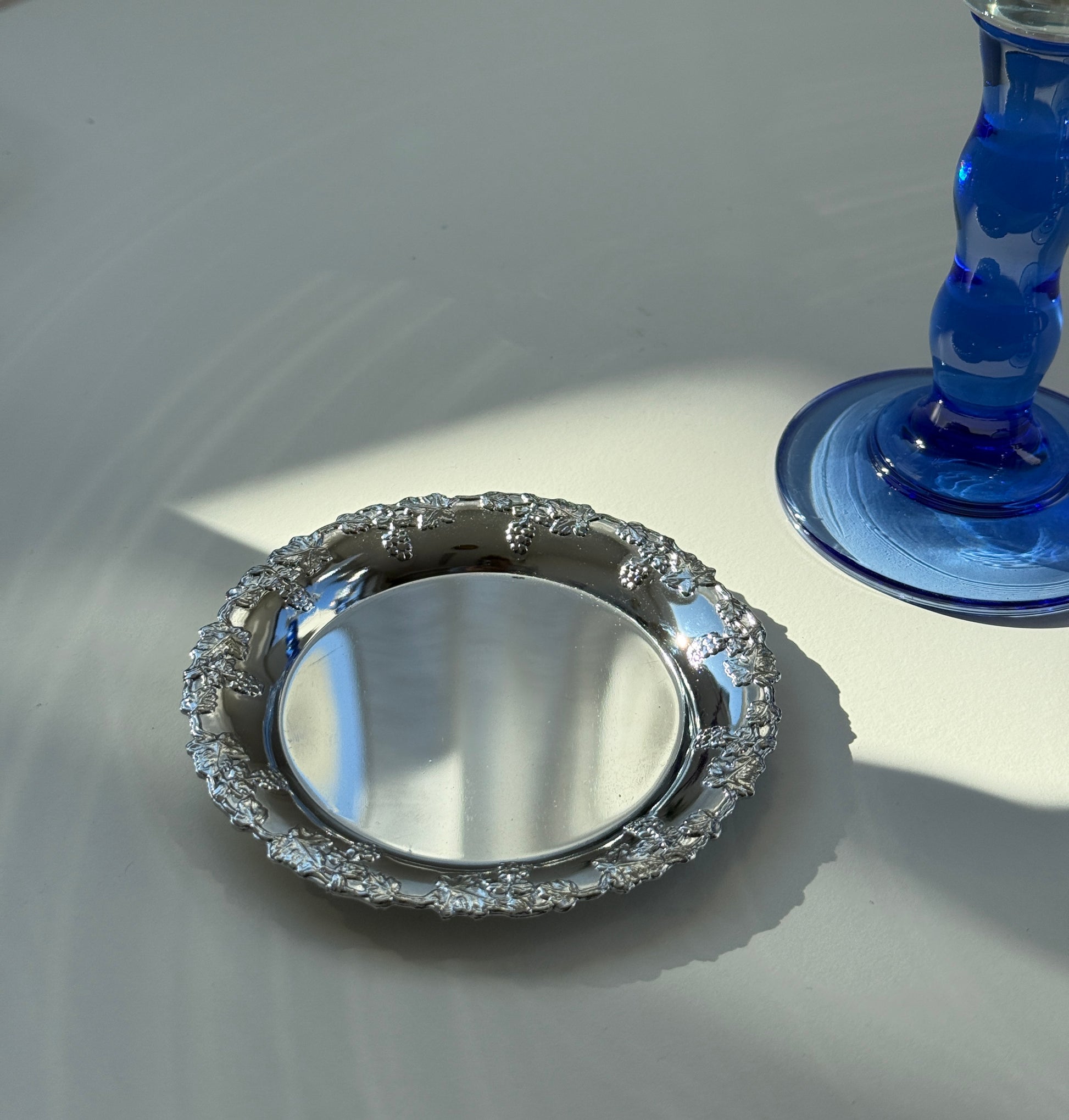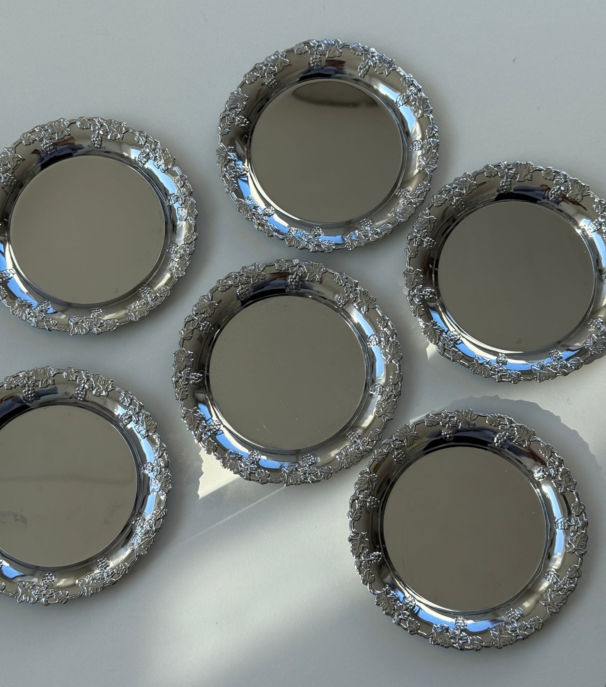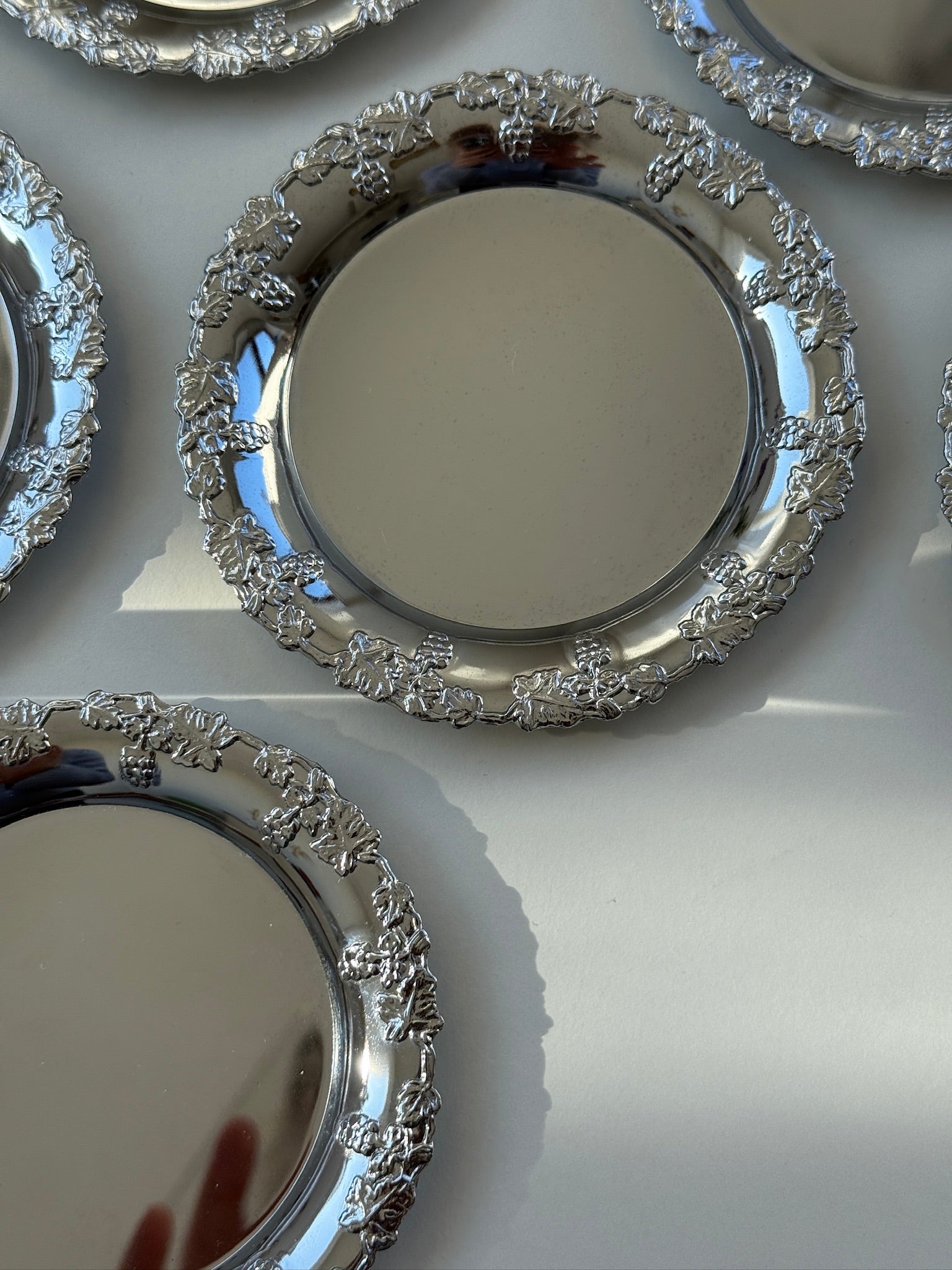 Utrolig smukke asietter i rustfrit stål med vindrueklaser rundt i kanten.