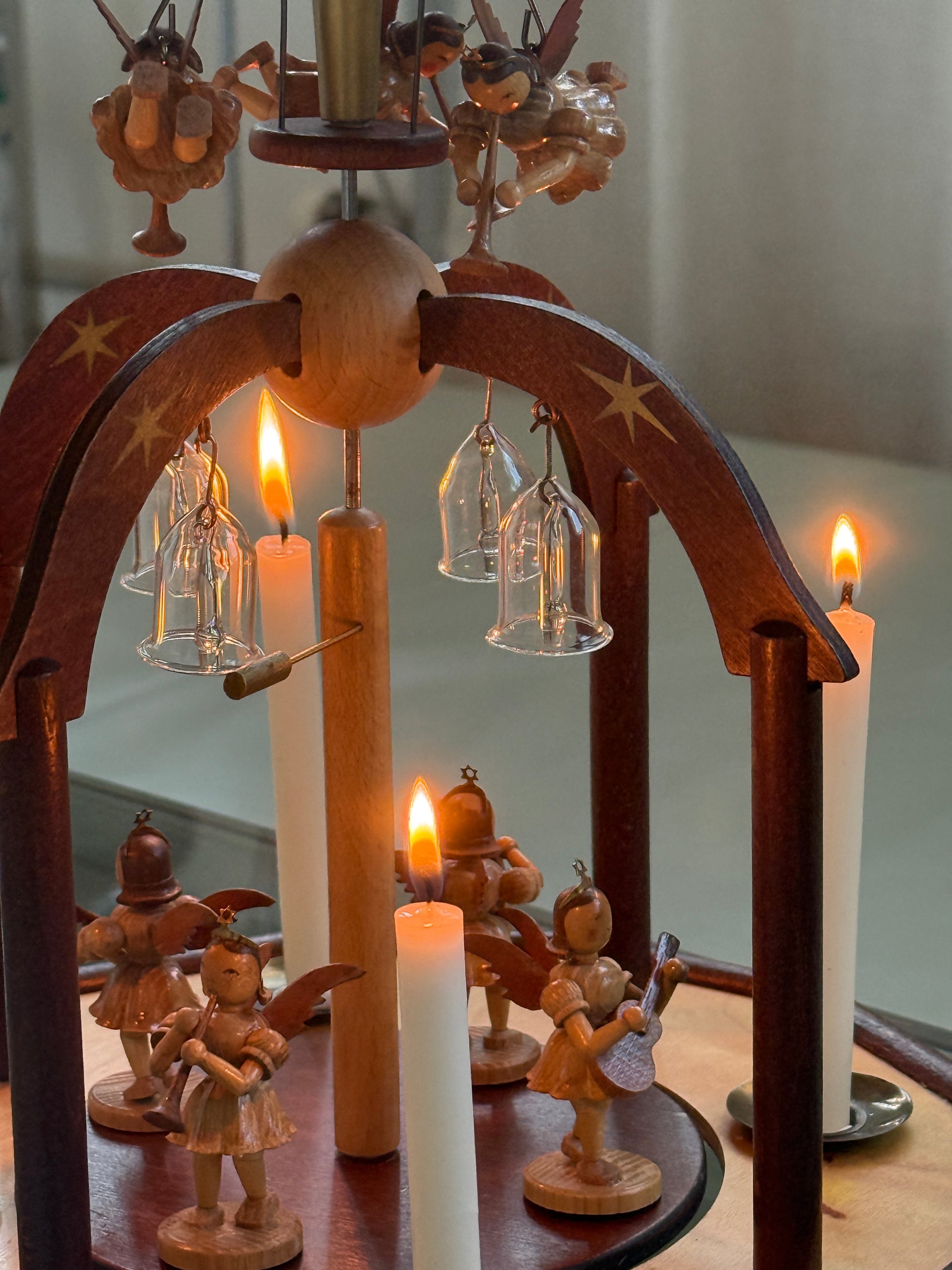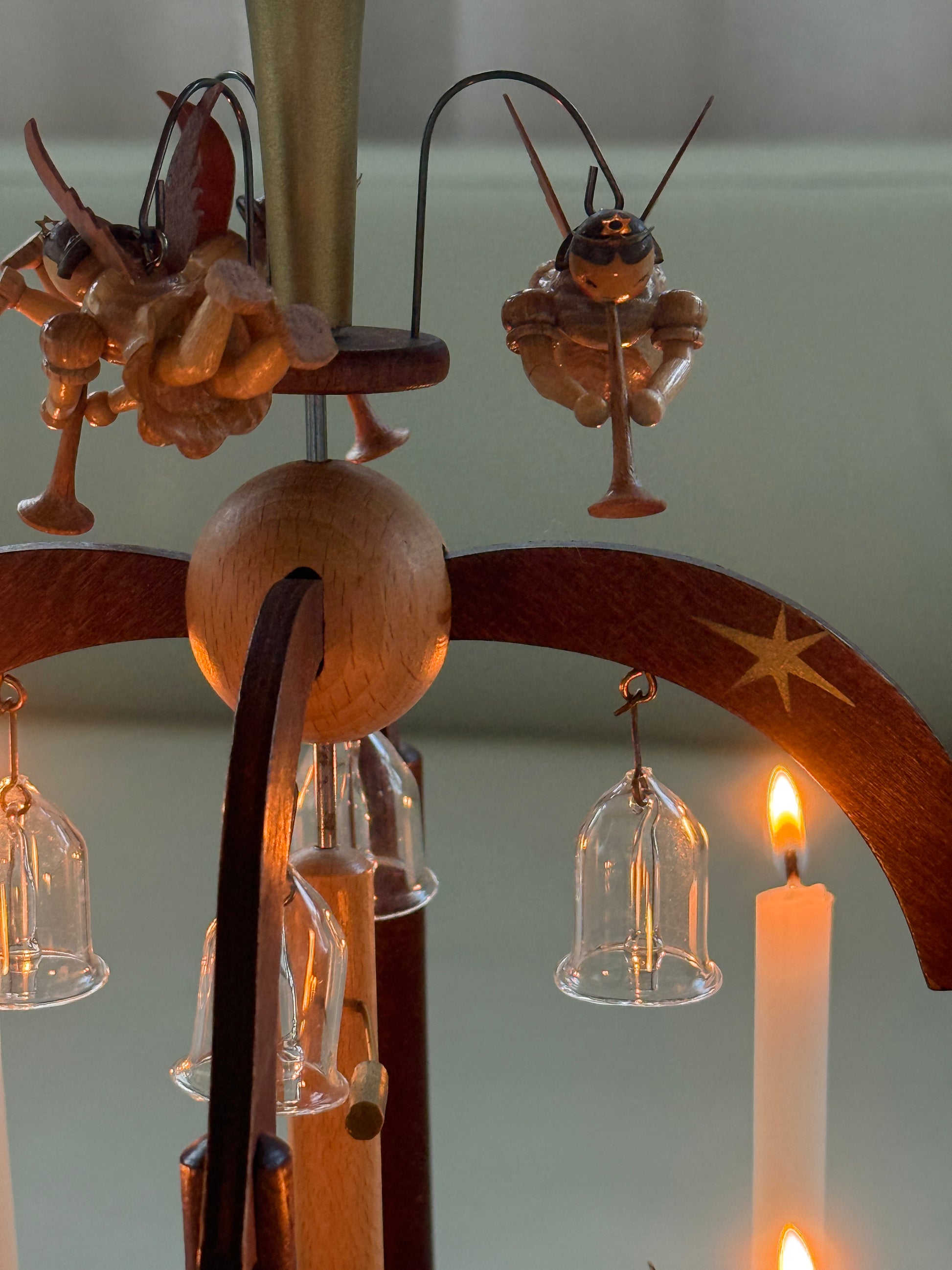 Øverst hænger tre engle med instrumenter, og under dem sidder fire glasklokker, der klinger svagt, når karrusellen drejer rundt. Nederst finder du et englekor med smukt udførte træfigurer.