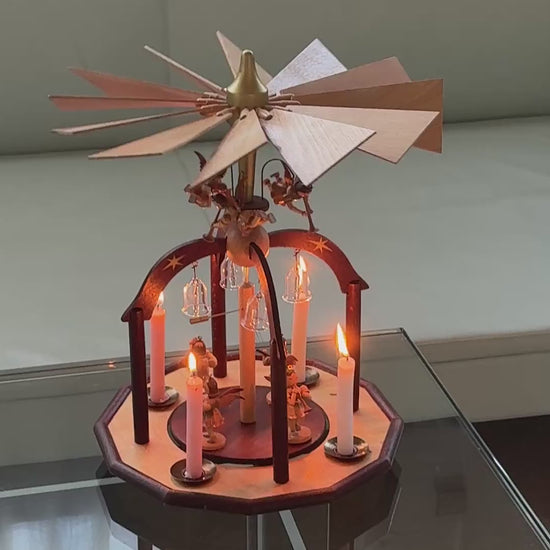 Smuk og original Erzgebirge julekarrusel i træ, udført i den klassiske håndværkstradition fra det tyske Erzgebirge. En virkelig charmerende model med et elegant og let udtryk, hvor både bevægelse, lys og lyd skaber den fineste julestemning.