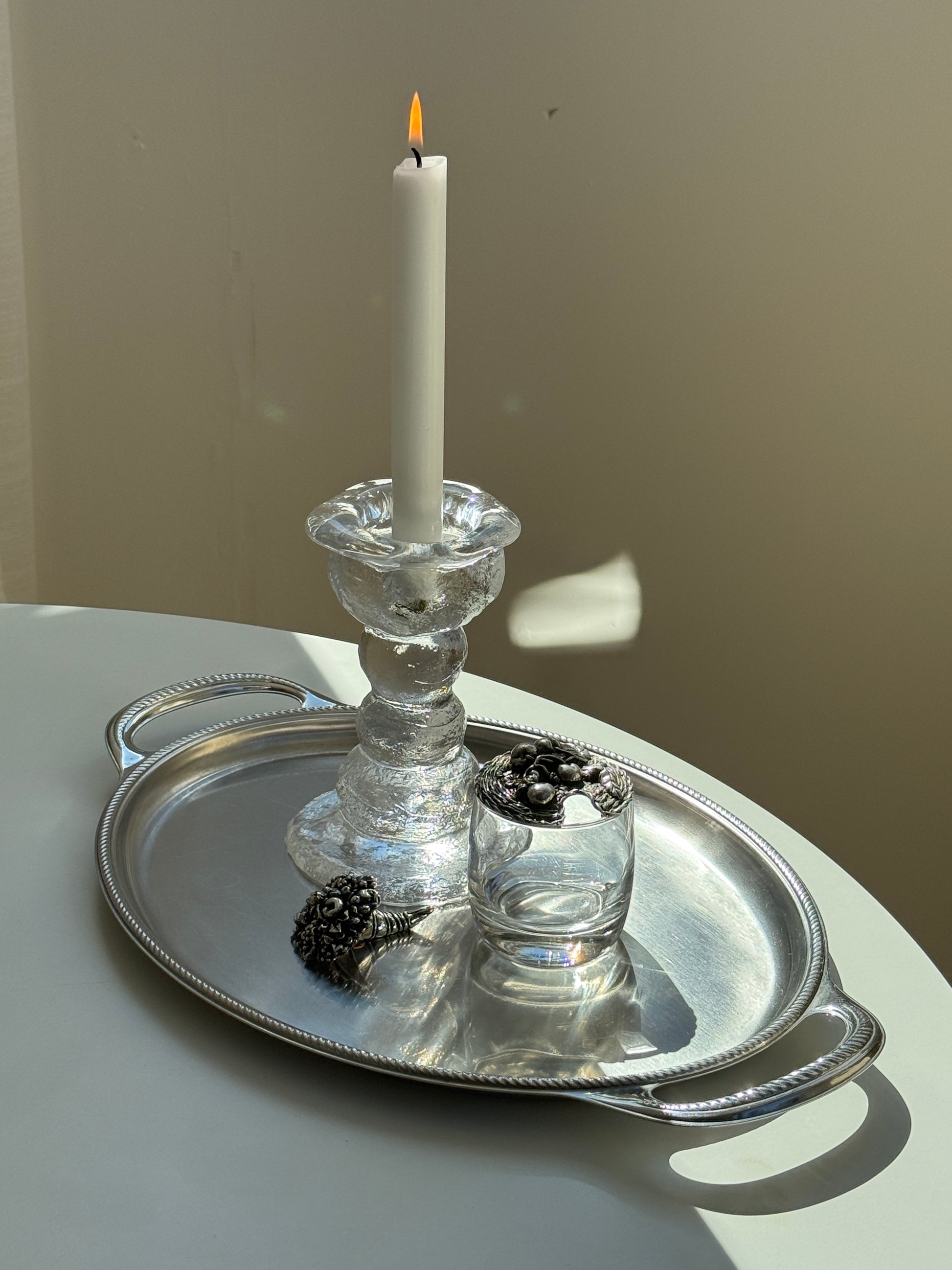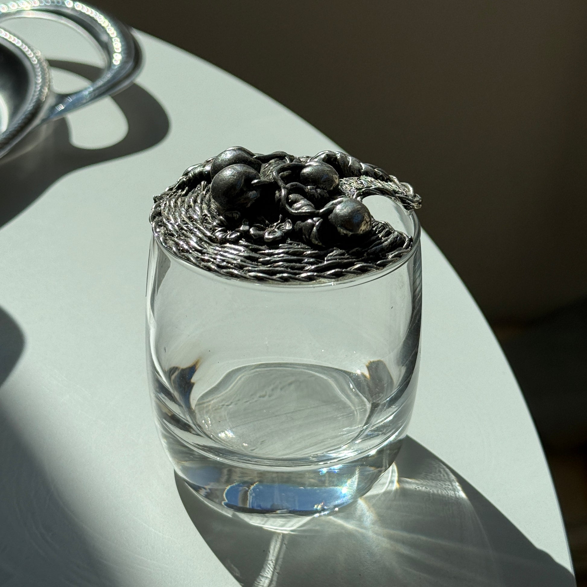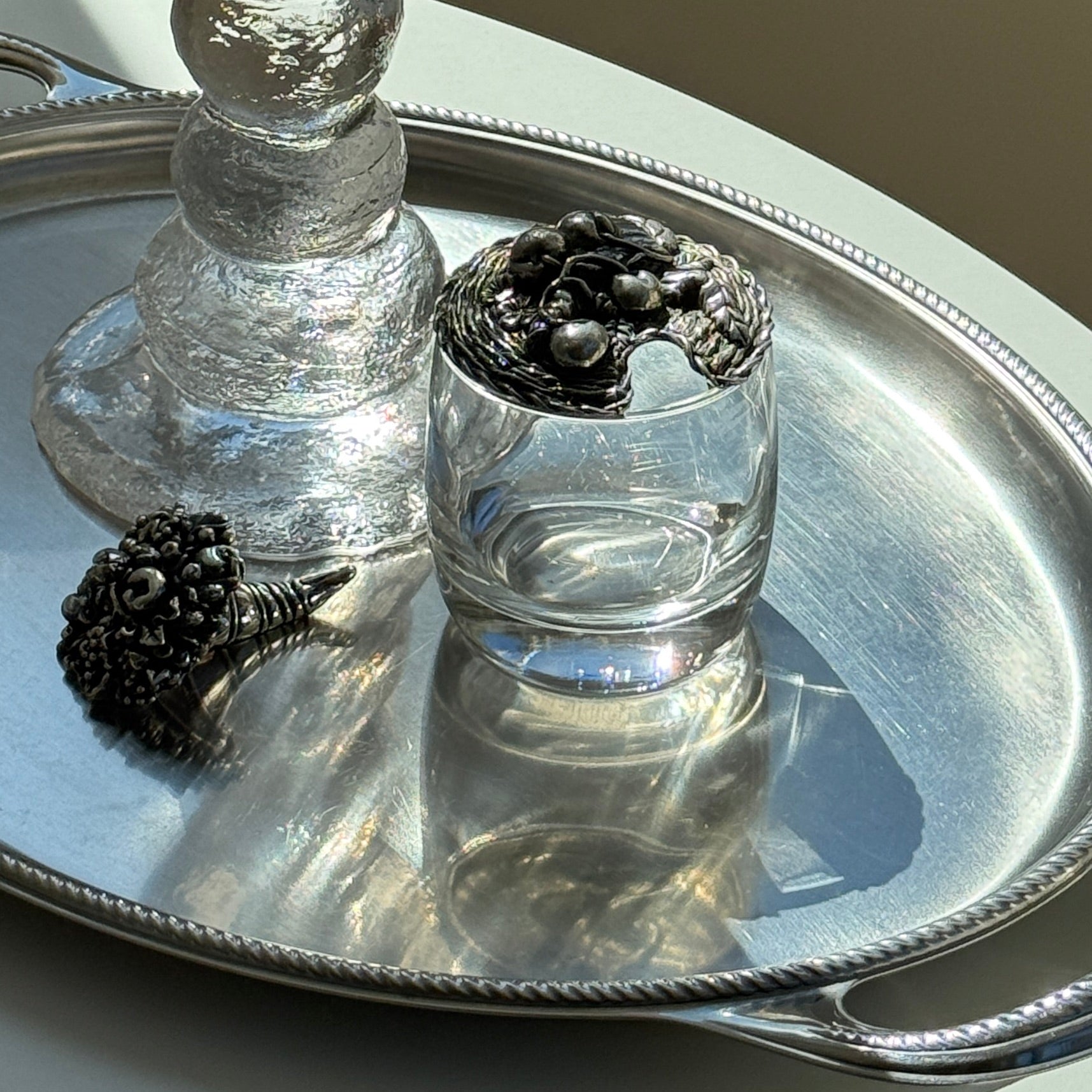 Dekorativ lille glaskrukke med smukt detaljeret låg i metal. Låget er udsmykket med et motiv af druer og blade, hvilket giver et elegant og unikt udtryk. Perfekt til små opbevaringer som smykker, sukker eller blot som en dekorativ genstand på bordet.