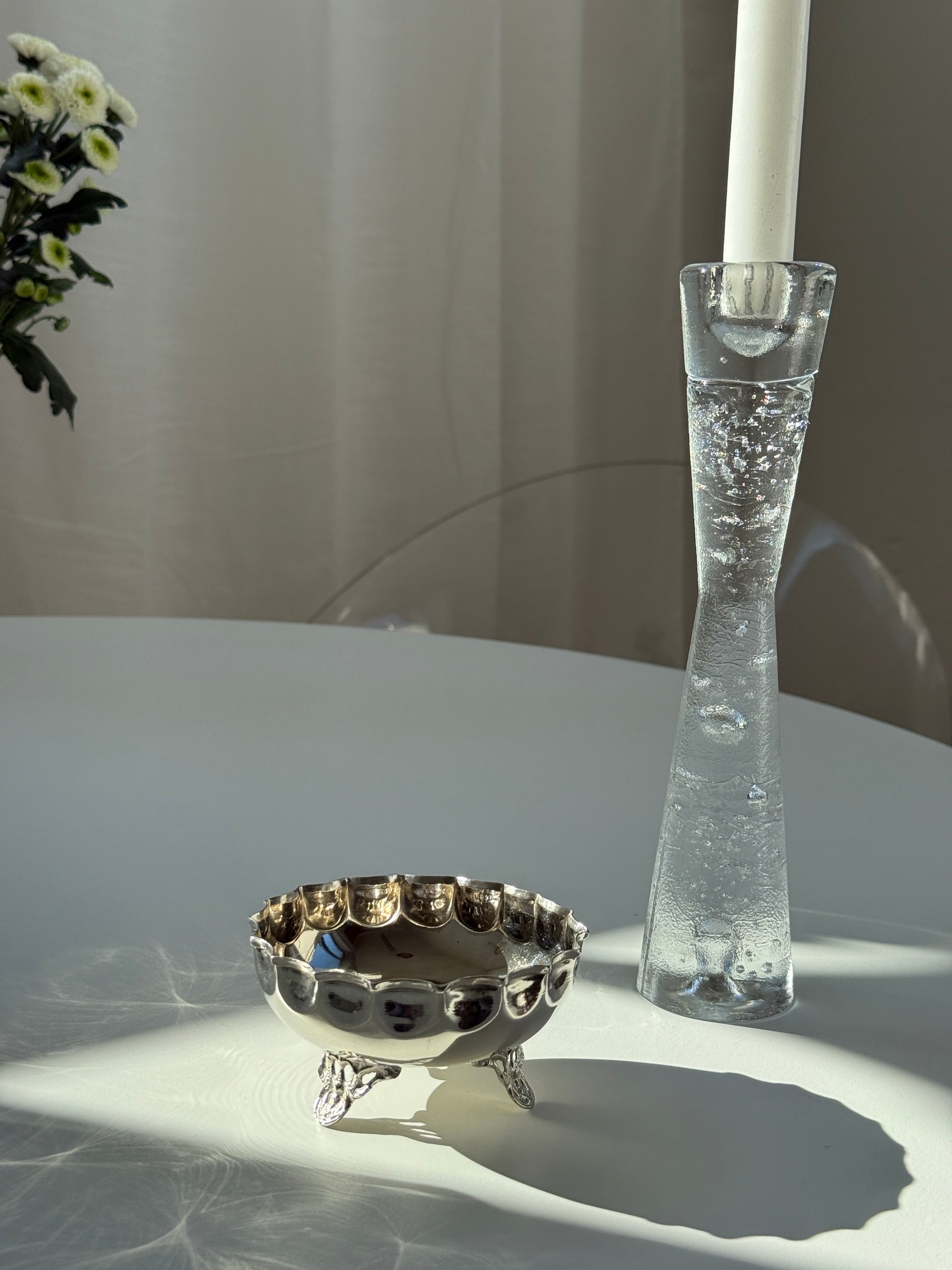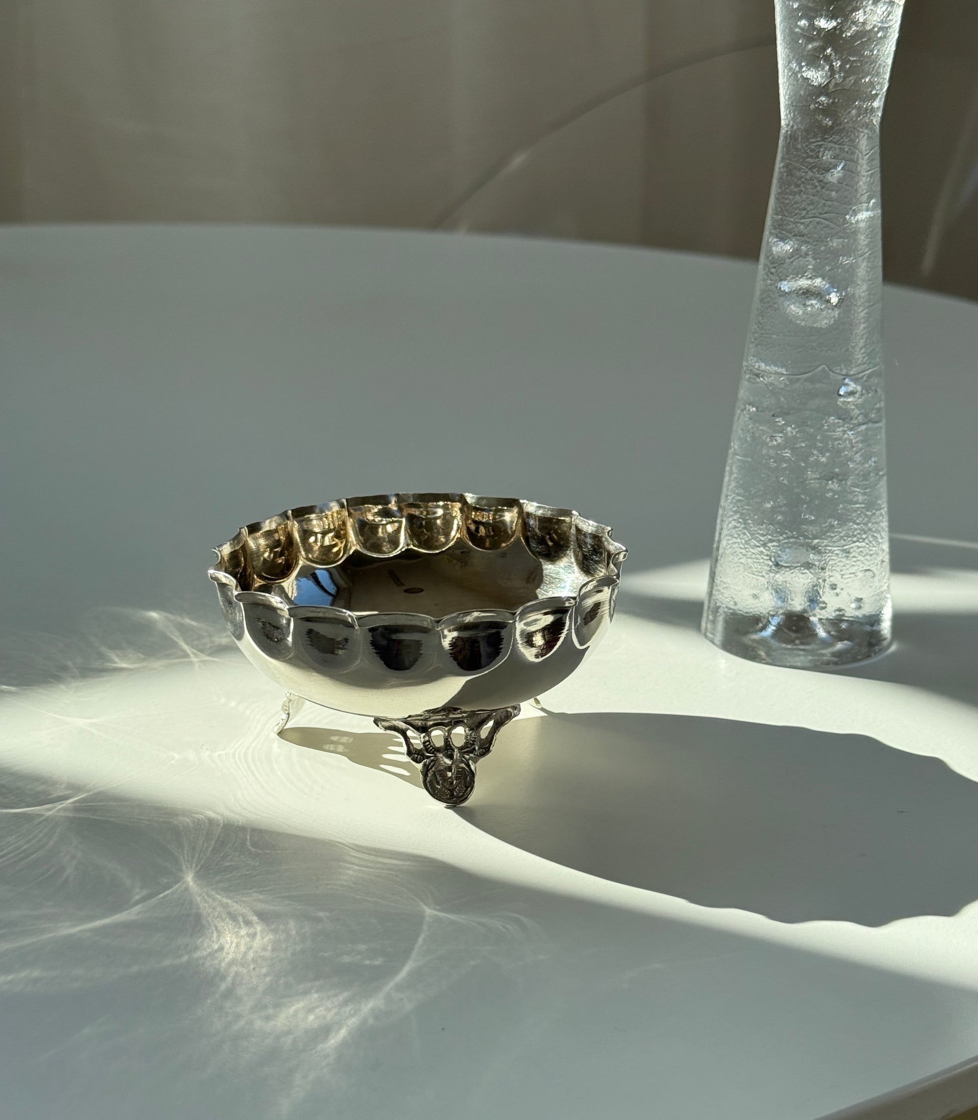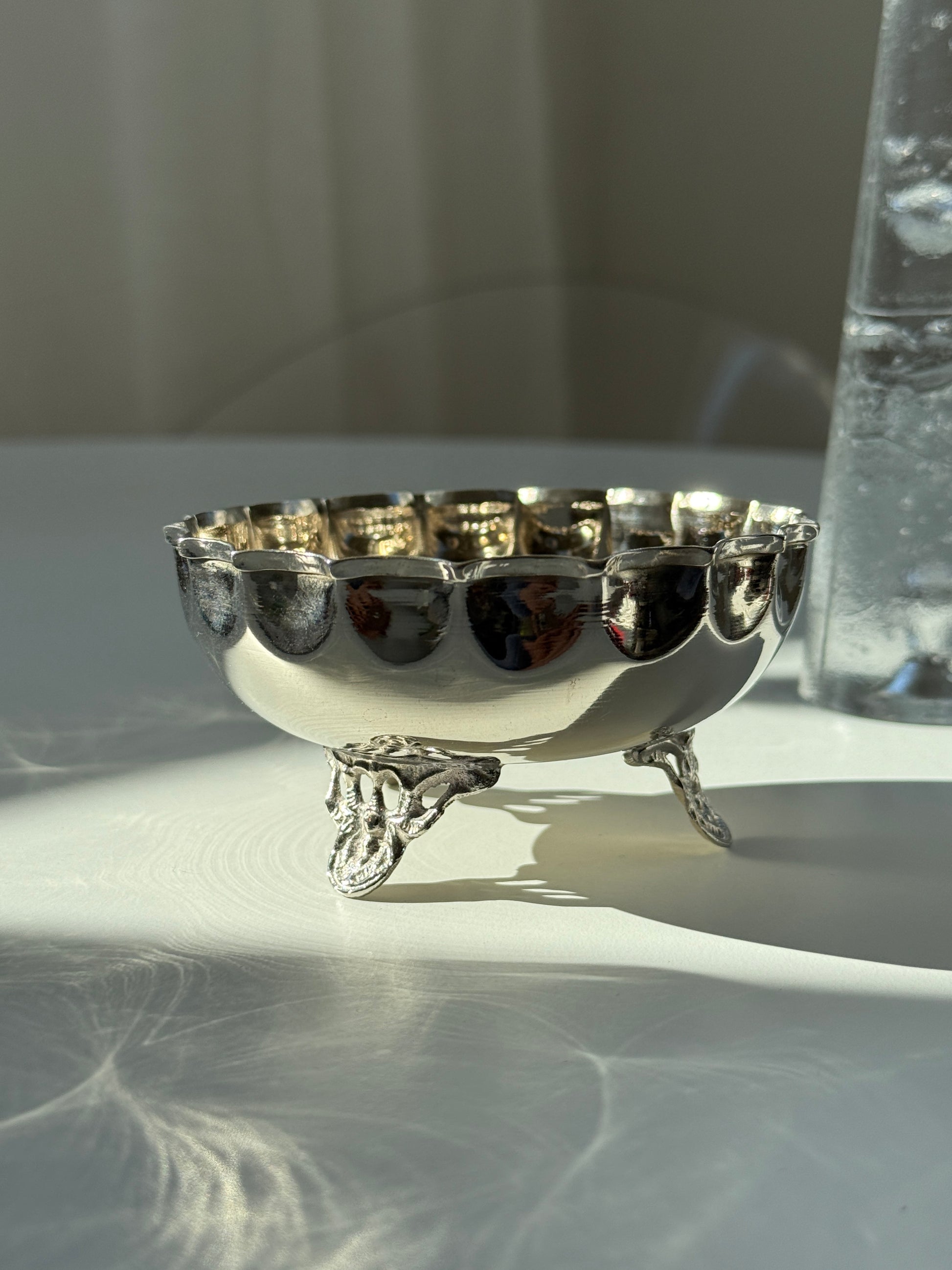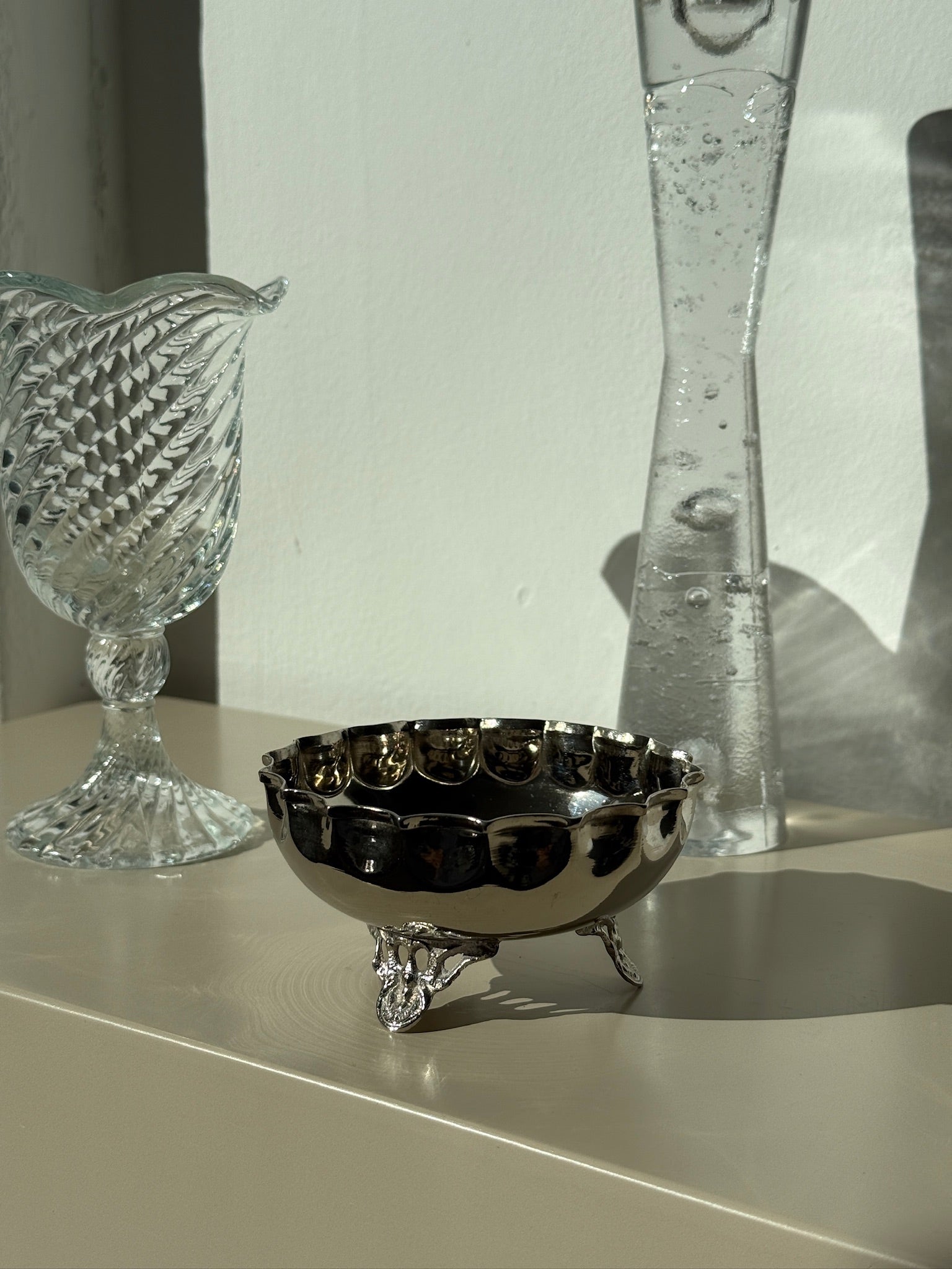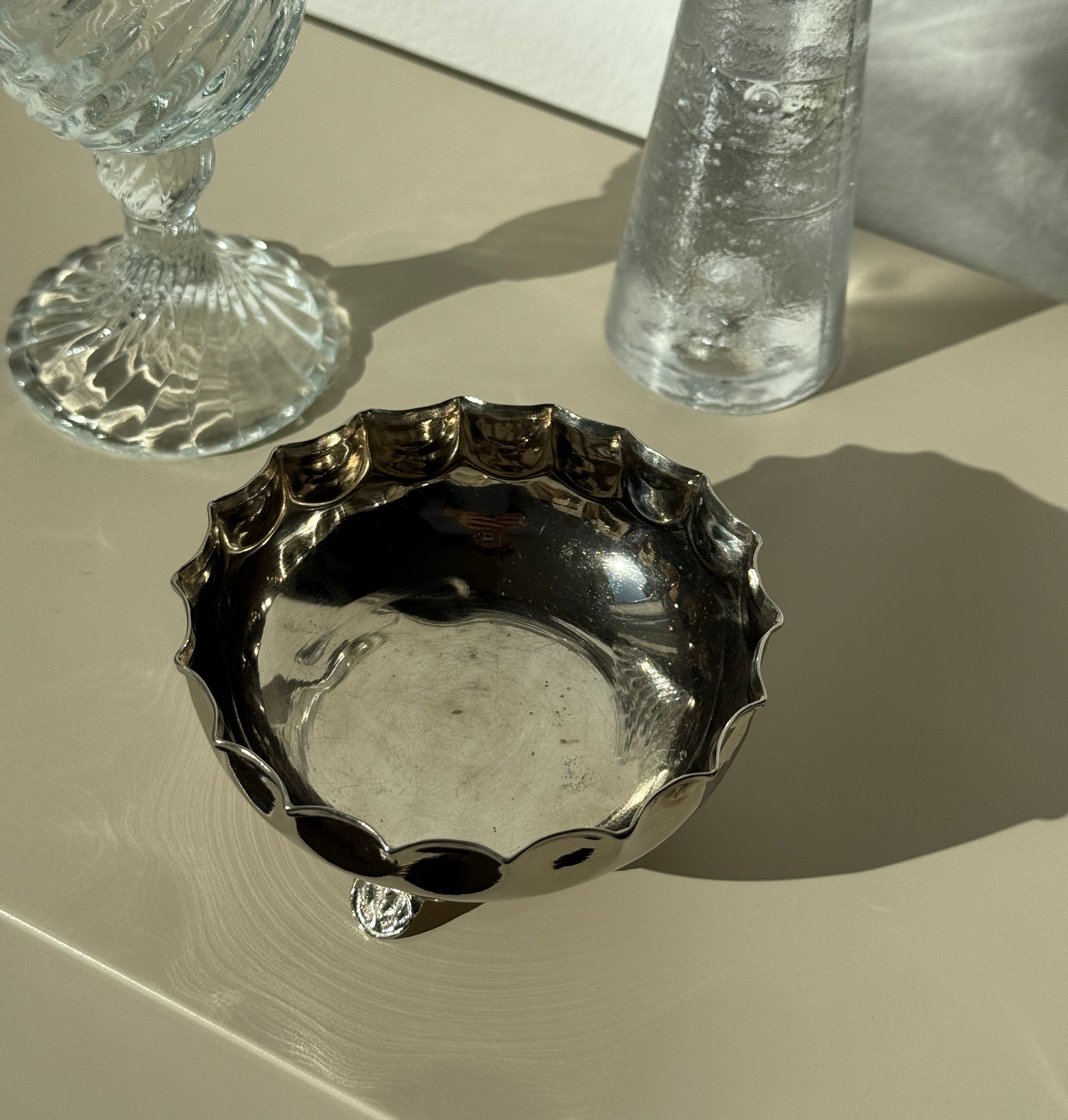 Lille vintage skål med flotte detaljer - smuk bølgede kant og tre detaljeret ben. Lavet i rustfri stål.
