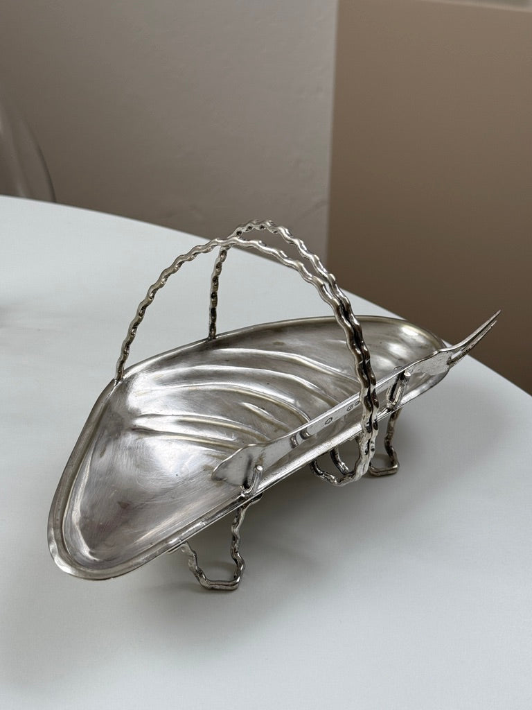 En charmerende sølvmusling på tre ben med hank – og endda en lille gaffel! De naturlige misfarvninger tilføjer en smuk patina, der understreger dens vintage charme. Et virkelig unikt fund!